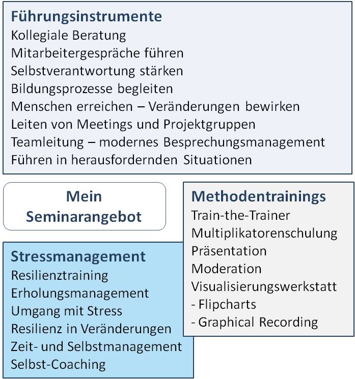 Mein SeminarangebotSie brauchen eine maßgeschneiderte Schulung für Ihr Team oder Ihr spezielles Schulungsangebot? Ich freue mich darauf mit Ihnen zu klären welche Maßnahmen und inhalte für Sie zielführend sind und entwickle Ihnen das passende Konzept.